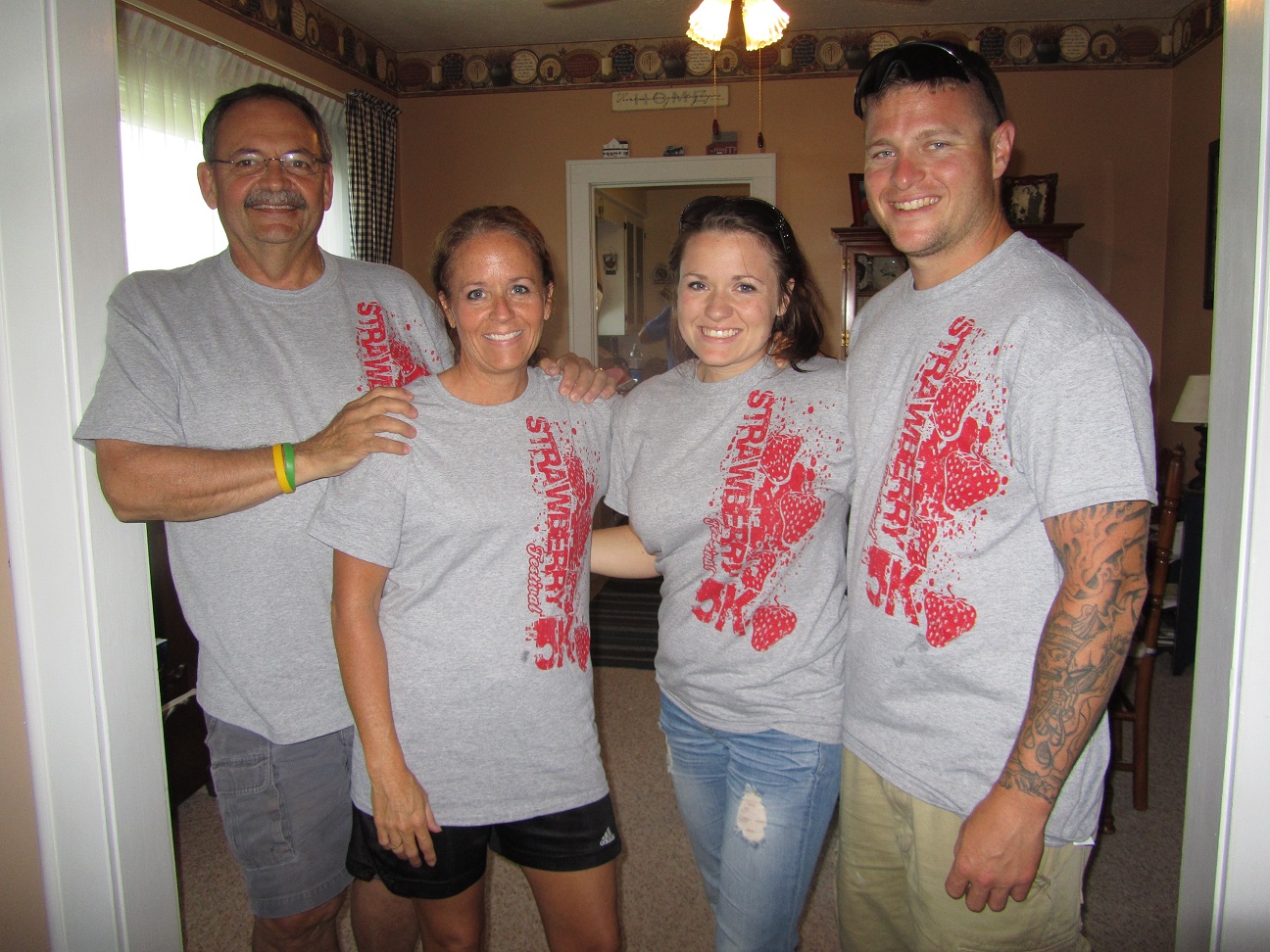 The day after the Strawberry race, my family got together at my sister’s house. Morgan and I decided it would be really cool if we all wore our race shirts. Gary and Kyle did not think it would be cool. They wore them anyway.