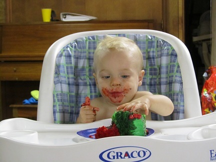 When I look around, I see that my friends who are also grandparents no longer fit the molds our grandparents so eagerly set either. They are also working out at the gym, running, walking, going to Zumba, taking classes, or somehow continuing to grow. I think we are setting an incredible example for our grandchildren. We are teaching them that one is never too old to set new goals, that we must remain physically active, and that learning is a life-long process. We are active grandparents who, rather than spoil our grandkids with cookies and pies, spoil them with our time and energy. Because we are active, we are able to really play with them. Because we are tech-savvy, we can also post all those adorable pictures (like this one from Layne’s first birthday where he has cake smeared all over his face) on Facebook! See, we are cool!
