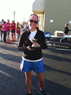 This past Sunday was the 40th Annual Turkey Day 5 Miler in Owensboro. Gary and I ran it three years ago, but were not able to the past two years because we had so much to do to prepare for Thanksgiving. Since we aren’t hosting this year, we signed up, along with about 20 other Perry Countians. It is incredible to see how running has grown in our community. We used to see a couple other Tell City runners when we went to races out of town, but now there is always a crew. For several, this race was the longest race they had run. What an accomplishment! As always, I looked at last year’s times. Owensboro runners are just fast. I looked at my age group, and realized that even if I hit my goal pace, which was 9:00, I would not even be close to placing. I was okay with that, and kept my goal. For some reason I was really excited about this race. Saturday night I bought some new songs from Itunes after researching running playlists. Sunday morning we skipped church (God understands that I had lots to do before taking off for the race). Gary and I had to go to Walmart that morning, so I finally bought some new earbuds. When we got home I loaded up the playlist and ran up and down our drive to make sure my new buds stayed put. Thankfully, we have no neighbors, so there was no one to witness my freakish behavior. I was so pleased with my music choices I just had to dance around outside. We had to go to a couple of stores before the race, so we arrived in Owensboro early. I was still pretty fired up, although my goal pace seemed less and less attainable as time passed. I am typically nervous on the way to a race, but the jitters didn’t start until we were within a block of the starting point. I was rather unreasonable at that point (just ask my husband). I wanted to be left alone to get in my zone, and I want to be prepared and at the starting line early. Then I worried that I would get too hot because I wore long sleeves. I decided I had no choice, and let that go. I wore a ruffled running skirt (super-cute), which I knew would make some of my running friends cringe. It makes me feel good to wear a running skirt (and to have a perfectly coordinated outfit), so I was happy with my choice. And so it was time to line up. I wished my husband and friends good luck, got my Iphone app ready, and waited for the gun. When it went off, we took off, and I couldn’t get my app to start! It only took a few seconds to get it set, but that didn’t make for a good start. I got going, and I went hard. I got totally absorbed in ‘Good Time’, and I ran. It was hard – really, really hard – but I was determined. When I hit the one mile mark, there was a guy yelling out times. I ran the first mile in 7:58! My first thought was Shit! I can’t run that fast! I knew I had to slow down or I would never make it to the end, but I also knew that if I didn’t slow too much, I could have a good average pace. I kept working hard. At the two mile mark, an older man came up on my left and fell into step with me. I began to pace with him. He told me that he hoped he wasn’t slowing me down, and I replied that he was keeping a nice, steady pace, and I needed that. He told me that if we could keep that pace, we would finish well. We ended up running the rest of the race together, and there were times that had he not been there, I would have slowed way down. He told me about running his first marathon; I told him about how to find good music, and the running app he could get on his Iphone. When I would begin to slow, he would motion for me to speed up and keep going. We crossed the finish line together – in 41:02! My goal was 45 minutes, and I finished in 41:02!!!!!! I was exhausted; I wanted to puke; and my body was spent. But I ran an 8:20 pace, which is the fastest I have ever run. I so appreciated my pacer, but I couldn’t even tell you what he looked like. We were side-by-side, and one can’t exactly try to run and look at someone’s face at the same time. I did get the opportunity to thank him when we were waiting for awards. And guess what! I placed 3rd in my division! Woo Hoo! If I can do that, anyone can. I am not an athlete; I wasn’t an athlete in high school. I didn’t begin running until I was 42 years old. With hard work, determination, and goals, we – all of us – can accomplish amazing feats. Now let’s talk post-race. That wasn’t so pretty or exciting. Almost immediately, my stomach began to hurt. And it didn’t stop. By the time we got home, not only did my belly hurt, but I was also absolutely exhausted. I began to wonder if I had pushed too hard. I questioned if it was even worth it. I spent the entire even lying on the couch. If I am stressed, whether it be mentally or physically, my stomach is the first to go. I think that because I ran 1 1/2-2 minutes faster per mile than I typically run, my body was stressed to the max. Fortunately, by the next morning I was pretty much back to normal, except for the sore muscles that are to be expected. Once I realized that I was likely going to live, I decided it was indeed worth the effort. I don’t know if I will ever run that fast again, but I did it Sunday, and that’s enough (for now). Congratulations to all of the Tell City runners! Many others placed; I don’t want to try to name them because I would surely leave someone out. Many met goals, and others overcame injuries and illness and finished with very respectable times. No one gave up! My husband beat his goal by over four minutes, running his fastest pace ever! Who says we have to slow down with age? I am so proud of my incredible running friends! I love seeing them do things they never thought possible. The next race is December 1; it’s a Holiday Hustle. Who’s in??
