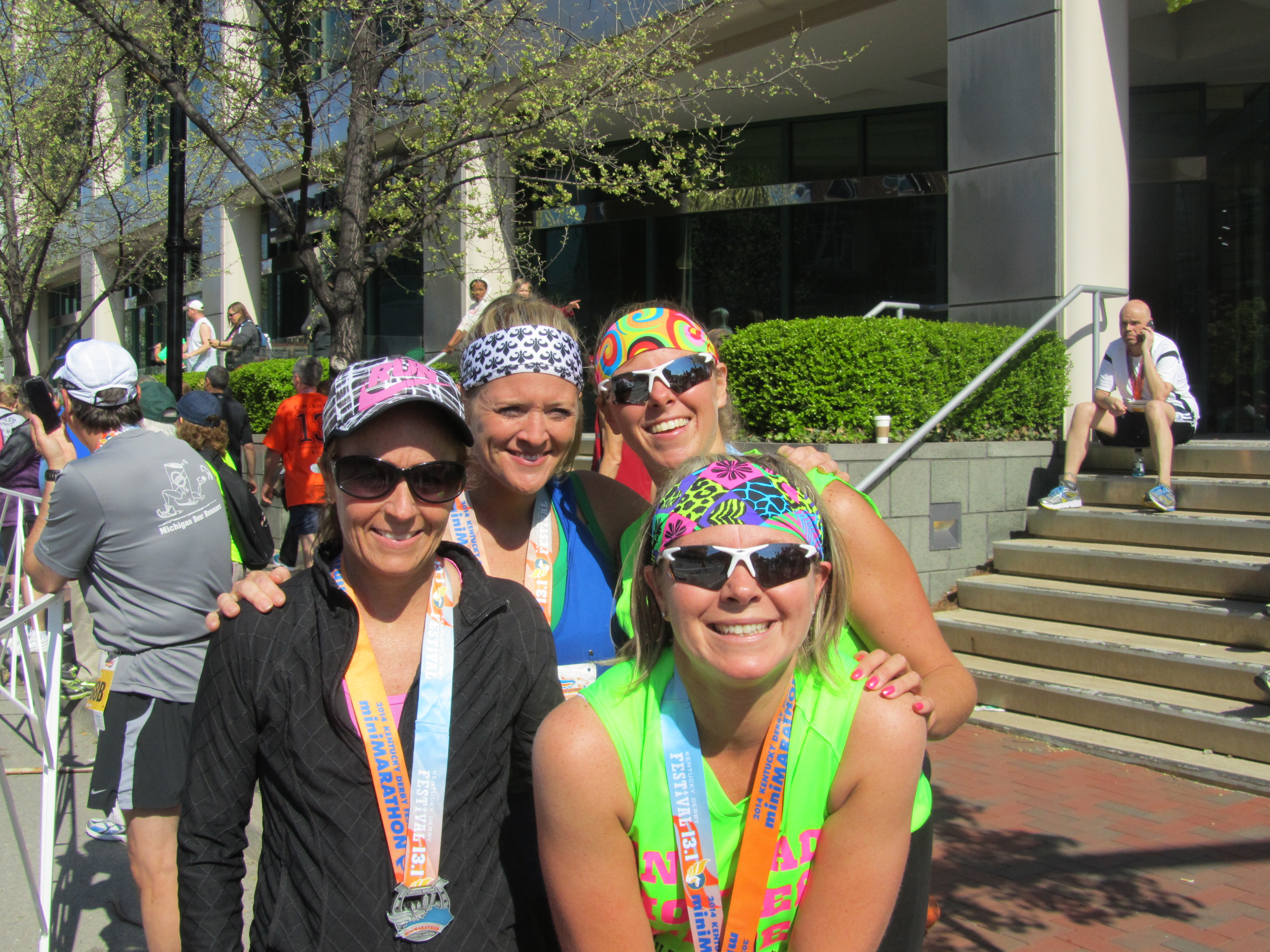 I know what you’re thinking…Damn, those knee braces are sexy! I took every precaution: lots of water, carbs all week, Aleve, rest days, compression socks, and knee braces. I wanted to finish this race. Once the crew of ladies arrived, I began to soak up their enthusiasm and relax (just a little). FYI…My daughter asked me what the purpose of the arm warmers was. When the race begins, it is usually early, and therefore, chilly. After one has run a few miles, she begins to warm up, and arm warmers are perfect to just slip off and stick in the waistband. I am not coordinated enough to take off a long-sleeved shirt while running. That would end badly. There are some who wear trashbags on them to keep warm before the race. Really? If I am going to be slow, I am going to look good, and a trashbag is just not very stylish.