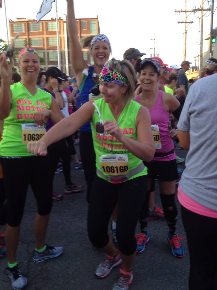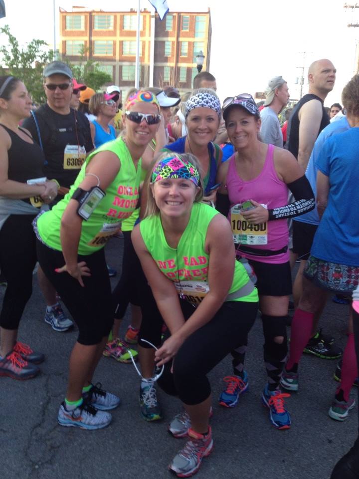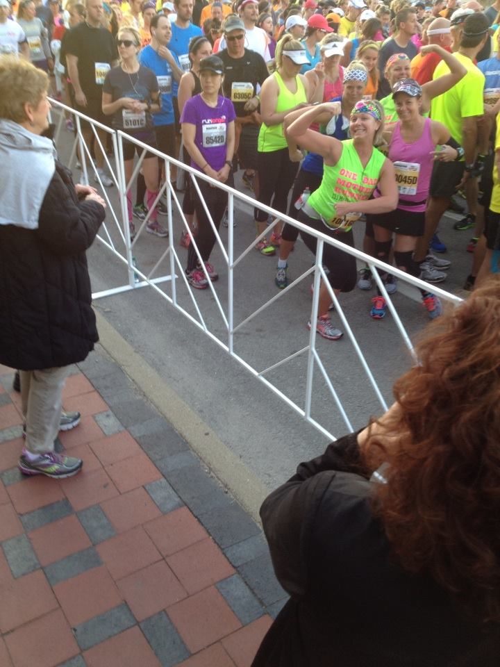 On the way back to the hotel I received a text saying that the Perry Country crew would be meeting for a group picture early the next morning. Again, I was determined to avoid the whole group thing. I was so nervous about this race that I was near tears many times on Friday, and again Saturday morning. I just couldn’t face all my friends who were so excited about the race. I had a certain degree of excitement, but an abundance of anxiety. Thankfully, my husband is a patient man, and when I suggested (demanded?) we go out another door to avoid everyone, he was very understanding (on the outside. I am pretty sure he was finally convinced I am nuts.). We made our way out of the hotel and down toward the start early Saturday morning. Gary knows that I don’t talk before a race, and he leaves me to my thoughts, which that day included a lot of self-doubt. We found my corral and I made my way through the waves of runners trying to remain on the outside of the crowd. Yes, I also have anxiety about crowds, and being in the middle causes heart palpitations and major sweat. I was supposed to meet my friend Danielle so that we could at least start the race together. When I didn’t spot her, I kind of began to panic. She is a very high-energy positive person, and I needed to draw from her energy that morning. I finally saw her and convinced her to climb through the fence and into our corral. Danielle, Kris, and Amber were all smiles and eagerness. I was all nerves, upset stomach, pounding head, and tightening chest.