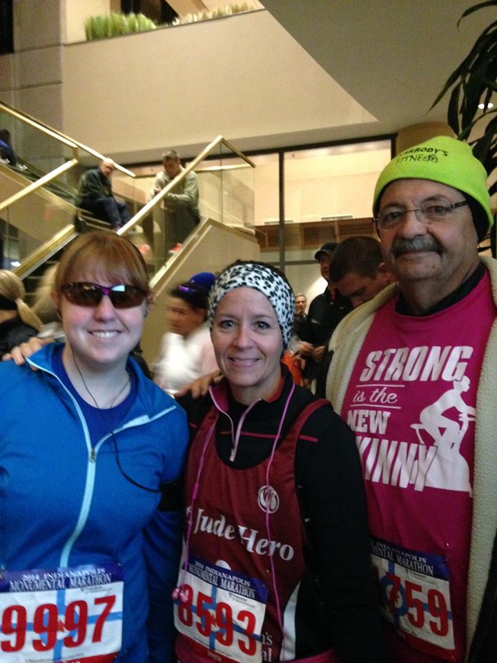 Then we arrived in Indianapolis for the Monumental Half Marathon. And it was freezing. I had kept a close eye on weather.com, but had hoped the meteorologists were mistaken. A 30 degree high? A windchill of 18? No way. Friday evening we did everything we could to avoid going outside. Thank goodness for the skywalks from the hotel to the expo and mall. We did have to venture out into the bitter cold to go to dinner. It was snowing! On Halloween night, it was snowing. The night before our race, it was snowing. It was only flurries that melted when they hit the ground, but I did not want to see any sort of white flakes. My niece from Chicago met us in Indy, and had failed to check the weather. She was not prepared for a cold run; we took care of that at the expo.